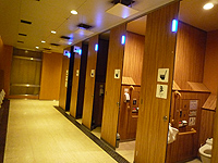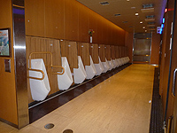 トイレに入ってまたビックリ! ここはどこの高級ホテルかと思いたくなるほどの贅沢さです。小便器は深いV字形で周りへの飛散防止効果が高いのでしょう。よく出来ていると思いました。便器の形状を表すイラストと共に空室状態を示す青いライトが点いています。
