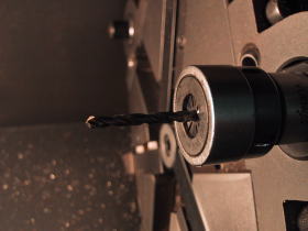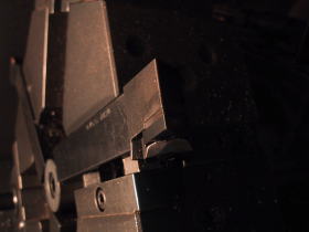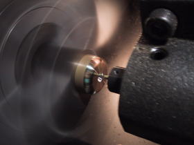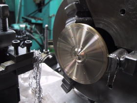 CDトランスポート・P-0の専用脚RK-P0の場合は長さが10センチ近くもある大きなキノコのような形をしております。それにインシュレーター部分=PB-REX(A)を靴に見立てて履かすような格好になっています。その二つの物を金属結合させた後、ハンダ層の部分の溝切りを1/100ミリ精度で加工するのですが、どうしても長く大きな物になると、チャックの掴みようによっては5/100〜20/100ミリのブレが出ます。 わざと旋盤のチャック側に遊びを持たしておいて、1個づつ槌で叩いて芯出しを1/100ミリまで追い込みます。いい加減に叩いているように見えますがその間約20秒位、叩く場所、叩く強さ、見る見るゲージの目盛りが追い込まれて行く・・・、とにかく神技です。そうすると回転させても写真のように完全に止まって見えます。精度を要求される物作りには、こうした職人の経験と技術に頼る部分がまだまだ沢山あるんですねぇ!、とにかく見ていて関心させられる事が一杯です。 |