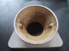結局木工所にも私のほうから予算のことは言わないからということで、職人気質に火を付けさせることに成功。特殊なノミを片手にロクロを回し完全に手動で正に腕1本でやってしまうそうです。ご覧のように出来上がったものは見事というほかありません。私も思わず「精一杯請求してくださいよ!」、とついつい言ってしまいました。本当に気持ちのいい瞬間です。 |