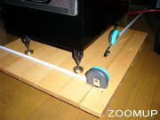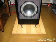 あらかじめ要らない雑誌を敷いておいて、その上にスパイクの付いたスピーカーをザックリと載せます。一人がスピーカーの片方を浮かせている間にスパイク受けのJRU(H)をスパイクにあてがったままの状態でそっと下ろすのです。スパイク受けに向けてスピーカーを載せようとすると絶対に上手くいきません。これぞコロンブスの卵です。