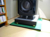 音の印象はスピーカーと足場の関係から来るもので抜けの悪さが私には気になりました。現在使ってあるベースは20ミリ強の合板の底に鉄板が貼り付けてあり、その要所と見られるヶ所に20ミリほどの木のキューブブロックが10個付いております。