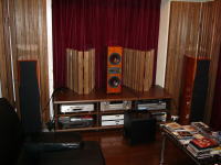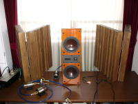 |  | そんな事で今日の最初の一手は、強力なエネルギーを持つ音響拡散パネルの使いこなしです。先ず最初はオーディオラックの上に置かれてある二組からです。方向性を確認し、1枚置き直しては聴いて頂きます。次は両サイドの背の高いパネルです。手前に付いている半分の高さの物が何かと悪さをしているので外した状態で聴いて貰います。もしも結果が悪いようであれば、いつでも元に戻せるわけですから気楽にやってみましょう。