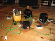 |  | 家に例えるならば一旦解体して立て直すぐらいの大掛かりな仕事です。先ずは200Vから100Vへのステップダウントランスのモディファイが基礎工事部分の仕事になります。容量も1Kから順に2k、3k、4,7kとまちまちですが、要は使い方次第。最適な働き場所を用意してやればむしろ好都合です。